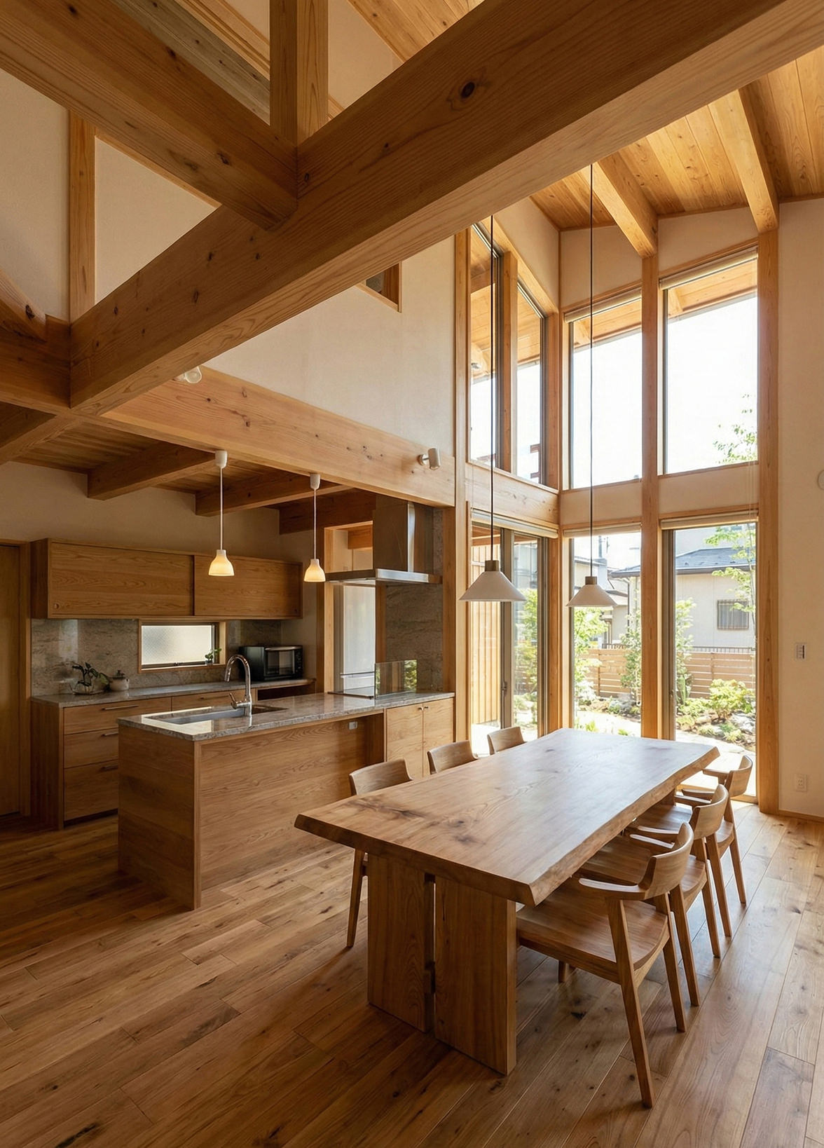 木の質感を活かし、家族が自然と集まる住まいを目指した木造住宅です。 天井まで伸びる梁と大きな窓が、室内に明るさと開放感をもたらします。ダイニングとキッチンは一体感のある設計とし、日々の会話が生まれる空間に。書斎スペースや造作収納など、暮らし方に合わせた工夫も随所に取り入れました。 外観には木の表情が引き立つ素材を採用し、周囲の景観とも調和。住むほどに愛着が深まる、温もりある一邸です。